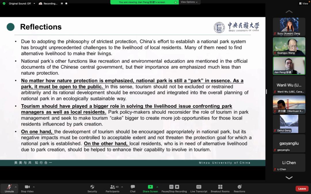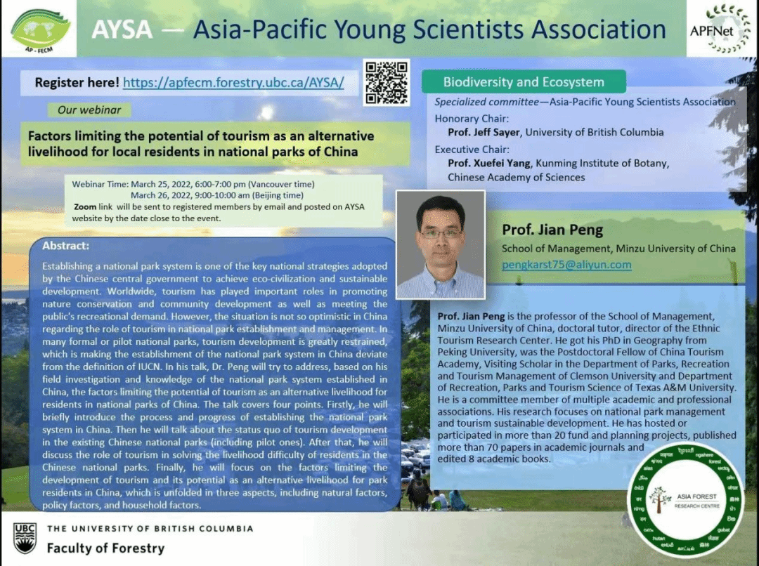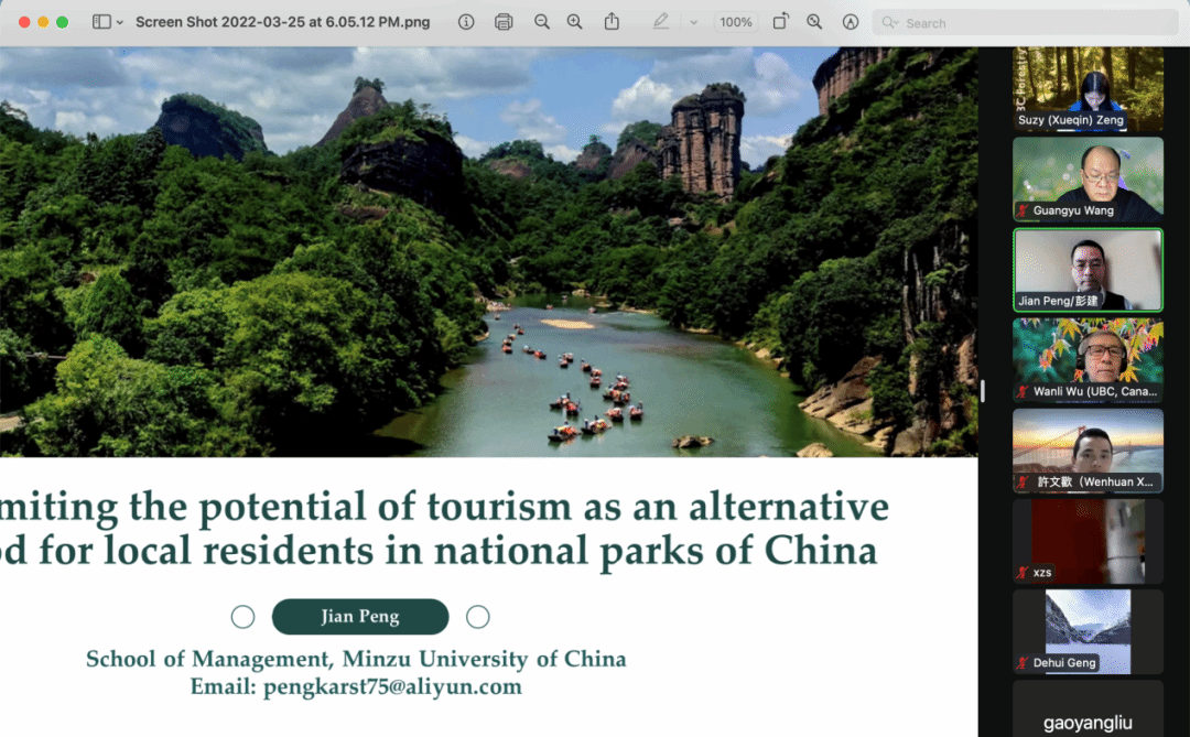彭建教授应邀做客UBC“全球国家公园管理系列讲座”,在线上为该院师生以及部分国内学者举行了题为“Factors limiting the potential of tourism as an alternative livelihood for local residents in national parks of China”的学术讲座。