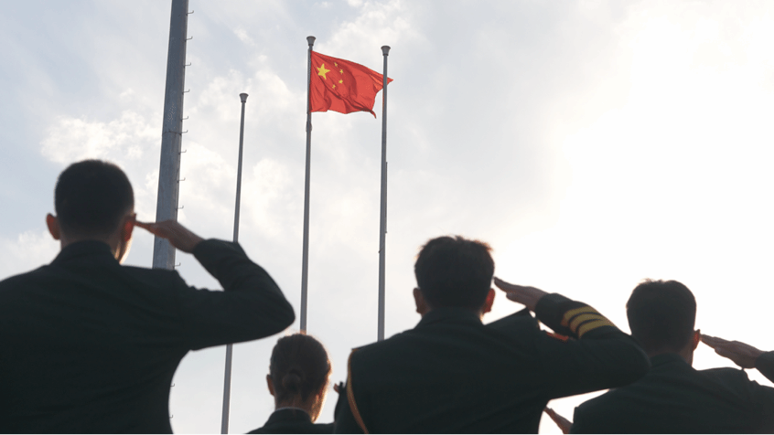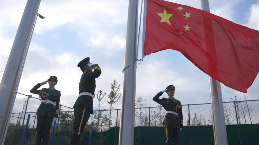 早上七点,升旗仪式正式开始,由2024级会计专硕退役大学生士兵计划学生侯嘉艺、王振钇、王海宁担任升旗手。随着国歌的奏响,鲜艳的五星红旗冉冉升起,全场师生向国旗行注目礼,齐声高唱国歌。